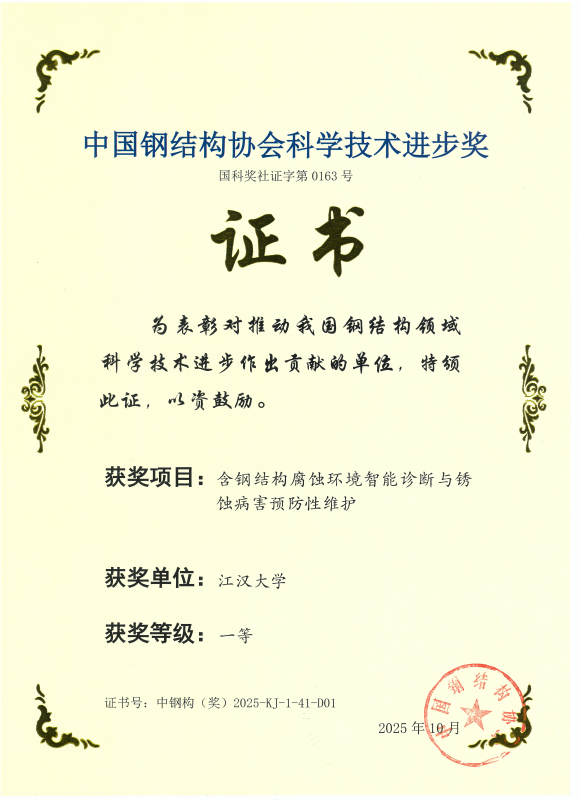 2025年10月,中国钢结构协会正式公布年度科学技术奖评选结果。江汉大学作为第一完成单位申报的科研成果《含钢结构腐蚀环境智能诊断与锈蚀病害预防性维护》,荣获2025年度中国钢结构协会科学技术进步奖一等奖。