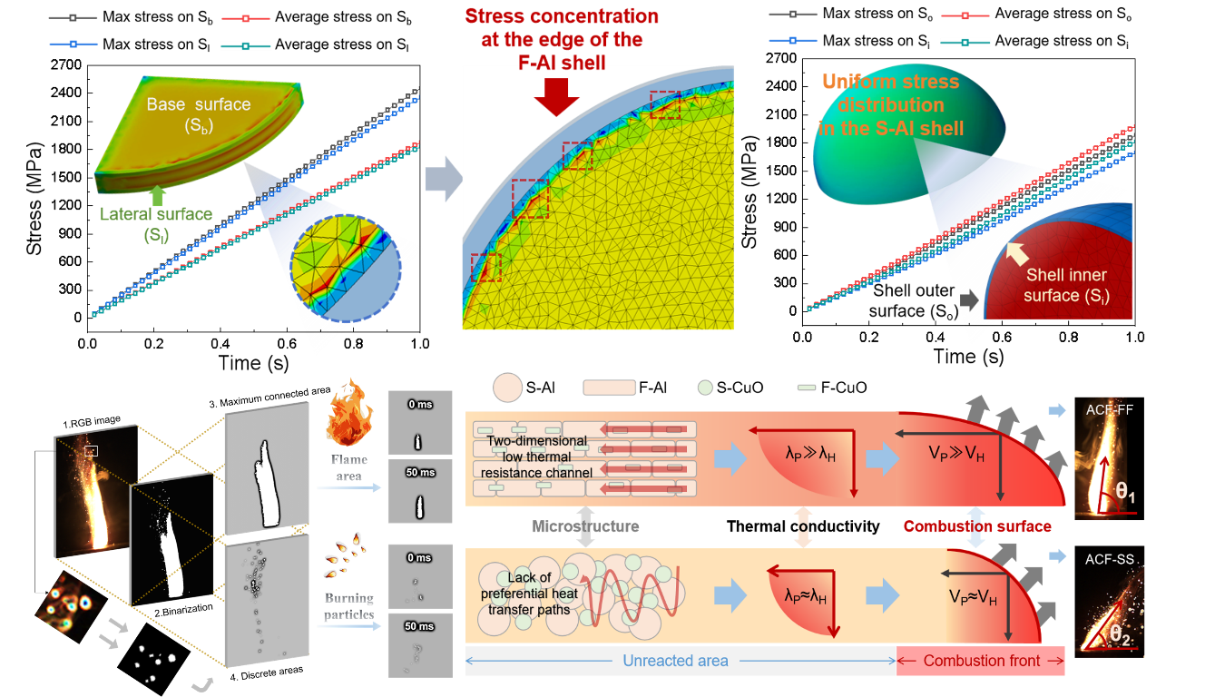 针对传统含能材料难以兼顾高力学强度与高反应活性的技术瓶颈,团队提出了一种基于多层次精密结构调控的智能含能材料“降感增敏”与“增强增效”设计新方法。该研究通过多尺度界面设计,协同调控含能材料内部的应力分布与反应传播路径,实现含能材料的选择性能量刺激响应。此外,利用结构精细设计产生的界面增强效应,显著提升了材料在高速冲击、高过载等极端环境下的结构稳定性。这种兼具“结构强韧、本质安全、快速响应、高效释能”特征的新型含能材料,为精细爆破、智能引信及新一代高效战斗部等领域的关键技术突破提供了重要支撑。该工作以Nanoarchitectonics-Enabled Stimulus-Selective Energetics: Nacre-Mimetic Interfaces Synchronize Structural Resilience and Enhanced Energy Release为题发表于《Advanced Functional Materials》,李经纬副教授为第一作者,刘旭文副教授为唯一通讯作者。