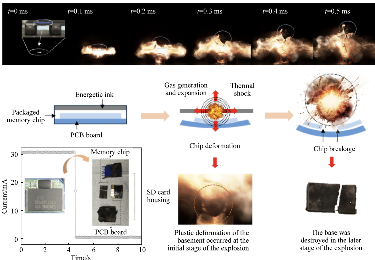 针对传统高能密度反应性材料难以实现能量释放速率与做功形式精细调节的瓶颈,团队研究了一种基于微观结构调控的能量编程策略,旨在构建具有“按需响应”特性的新型含能架构。研究通过对火炸药内部反应路径的多级精确剪裁,成功实现了能量释放过程的分步可控化。此外,利用低阈值预激活反应耦合高效气相膨胀机制,在大幅降低启动能量需求的同时,显著提升了约束空间内的升压速率。在实际应用验证中,该技术展现了卓越的毫米级精细爆破毁伤能力,能够对高价值电子功能部件实施毫秒级的定点物理销毁,为构建具有自适应调节能力与极致做功效率的智能含能系统提供了全新的理论视角与技术路径。该工作以Lattice fluorination-enabled programmable energetics in metastable intermolecular composites: Atomic F/O engineering and hierarchical redox control enabling instantaneous memory chip destruction为题发表于《Defence Technology》,李经纬副教授为第一作者,刘旭文副教授为唯一通讯作者。