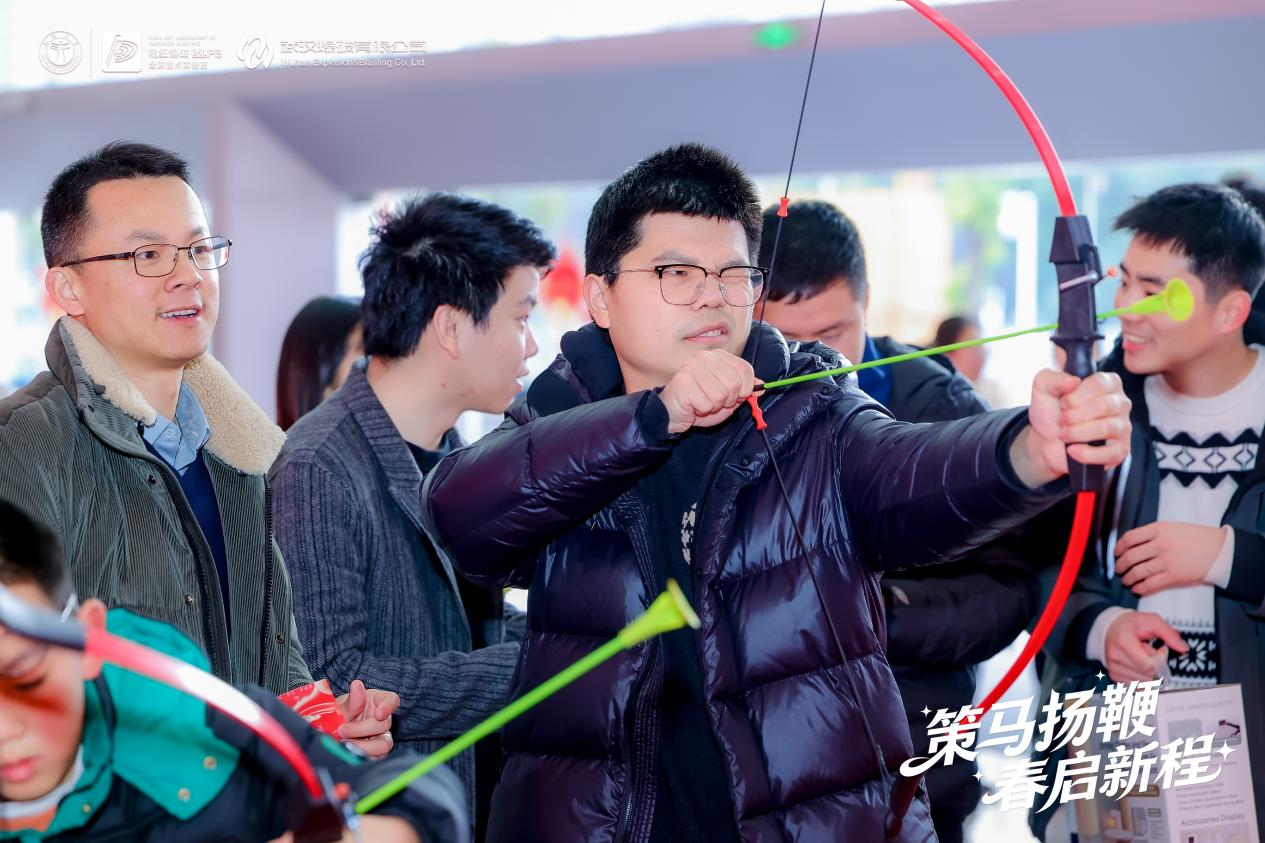 一箭凌云志,聚力向未来。在箭指未来体验区,教职工们精神抖擞、意气风发,拉弓搭箭、全神贯注,动作舒展有力。谢礼立、谢先启两位院士亲临活动现场,兴致盎然地体验射箭项目,并与在场教职工亲切交流动作技巧、分享运动心得。大家在传统射箭运动中尽享竞技之乐,更以“马到成功、箭无虚发”的美好寓意,互致新春祝福。